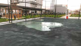 Resurfacer malzeme tamamen kuruduktan sonra, akrilik cushion katı uygulaması yapılacaktır. Uygulama yapım aşamaları; ilk olarak akrilik resurfacer malzeme büyük ve temiz bir varilin içerisine boşaltılacaktır. Boşatılan malzemeye ilave olarak belirli oranda silis akrilik kumu ve toz granül malzeme ilave edilecektir. Malzemeyi inceltmek amacı ile karışıma su ilave edilecektir. Oluşan karışım bu iş için özel üretilmiş karıştırıcı ekipmanı ile karıştırılacaktır. Malzeme tamamen karıştırıldıktan sonra saha yüzeyine lastik gelberi vasıtasıyla uygulanacaktır. Uygulama toplamda üç kat olacaktır ve ortalama sarfiyat 1350 gr/m2 olacaktır.