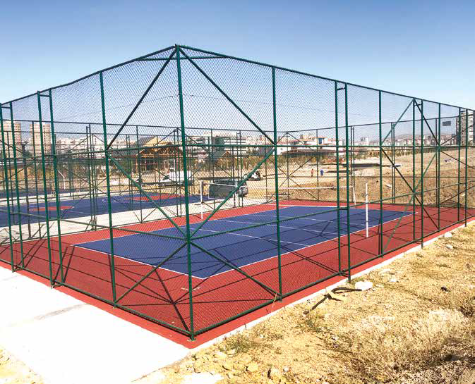 Oluşturulan metal kargas üzerine çelik gergi halatı yada gergi teli montajı yapılır. Daha sonra 50x50x3,50 mm yada 40x40x3,50 mm PVC kaplı tel örgü montajı yapılır ve bağ telleri yardımı ile metal kargasa tutturulur. Sahanın istenilen bölgesine yaya kapısı montajı yapılır. Bütün metal aksam elektrostatik fırın boyalı olacaktır.